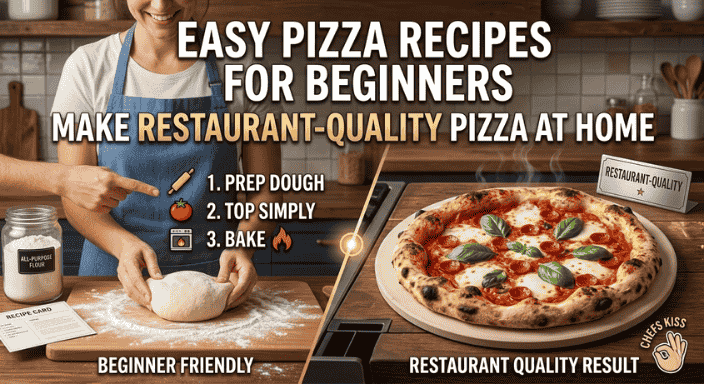 Learn easy pizza recipes for beginners — from homemade dough to perfect toppings. Make delicious pizza at home with simple ingredients and zero stress.