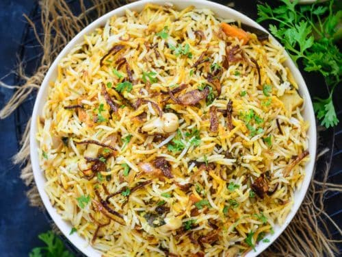 एक लोकप्रिय मसाला और सब्जियों का मिश्रित पसंदीदा चावल का व्यंजन जो आमतौर पर बिरयानी ग्रेवी और बासमती चावल को सपाट तल के बर्तन में बिछाकर तैयार किया जाता है। पारंपरिक रूप से दम बिरयानी मांस, सब्जियों और चावल के मिश्रण से तैयार की जाती है, हालांकि यह केवल सब्जियों के साथ एक शाकाहारी विकल्प है।