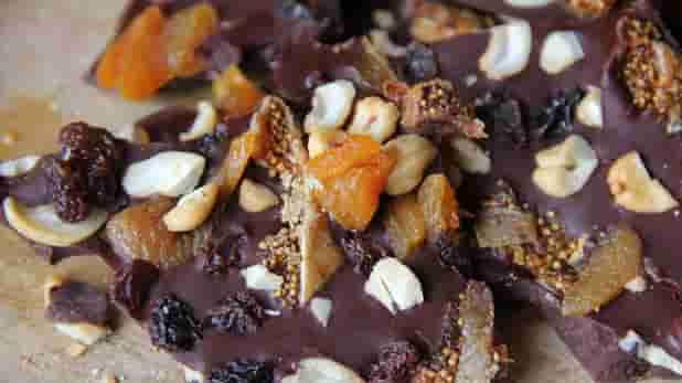 मेवे वाली चॉकलेट में नट्स, काजू आदि ड्रायफ्रूट्स जमा करके बनाए गए मेवे जल्दी से बनने वाली चॉकलेट बार्क है। बच्चे इसे बहुत पसंद करते हैं। यदि आप चॉकलेट पसंद करते हैं, तो आप किसी भी त्योहार पर चॉकलेट की छाल बना सकते हैं।